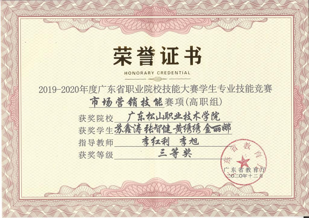 上一条:2.2.4 2017-2018年度广东省职业院校技能大赛市场营销赛项 二等奖 下一条:2.2.6 2020-2021年度广东省职业院校学生专业技能大赛高职组“电子商务赛项”一等奖