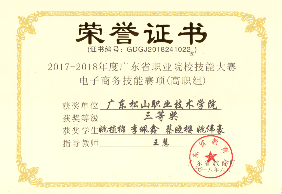 上一条:2.2.7 2018-2019年度广东省职业院校学生专业技能大赛高职组“电子商务赛项”三等奖 下一条:2.2.9 2013年全国职业院校技能大赛高职组广东选拔赛一体化物流方案设计与实施项目 三等奖