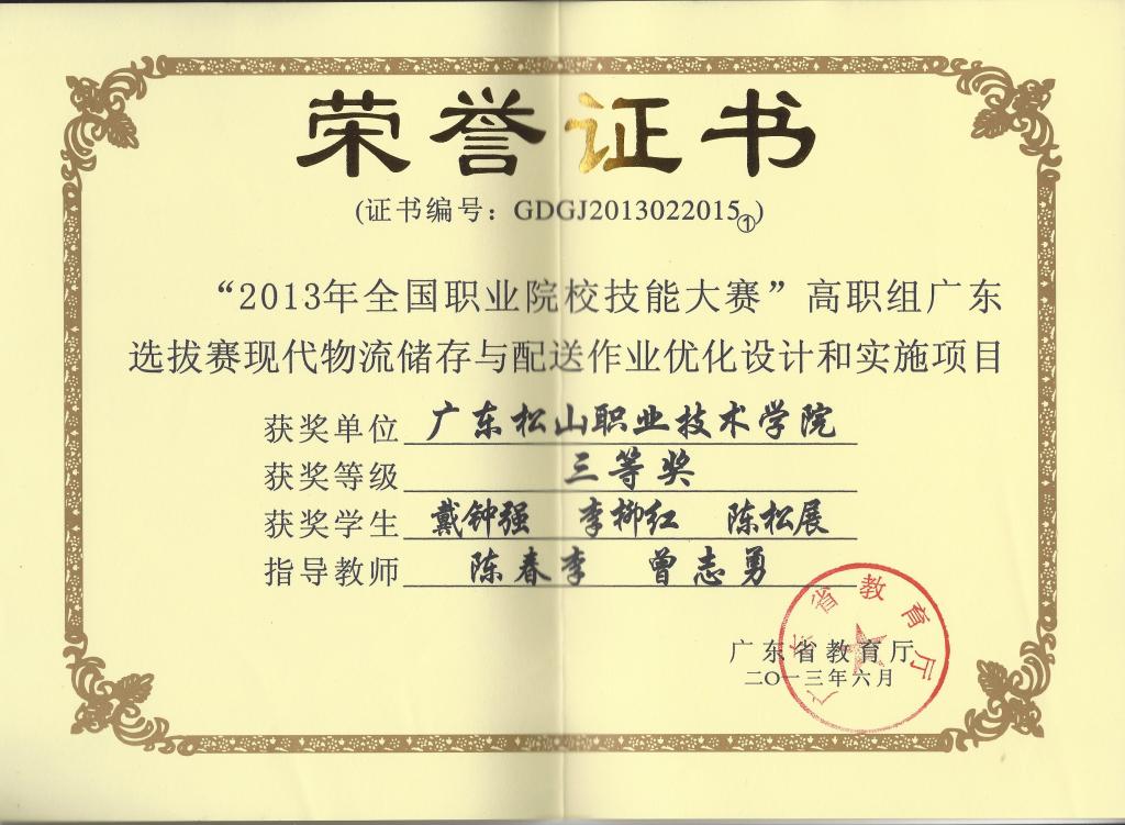上一条:2.2.8 2017-2018年度广东省职业院校学生专业技能大赛高职组“电子商务赛项”三等奖 下一条:2.2.10 2014年全国职业院校技能大赛高职组广东选拔赛一体化物流方案设计与实施项目 三等奖