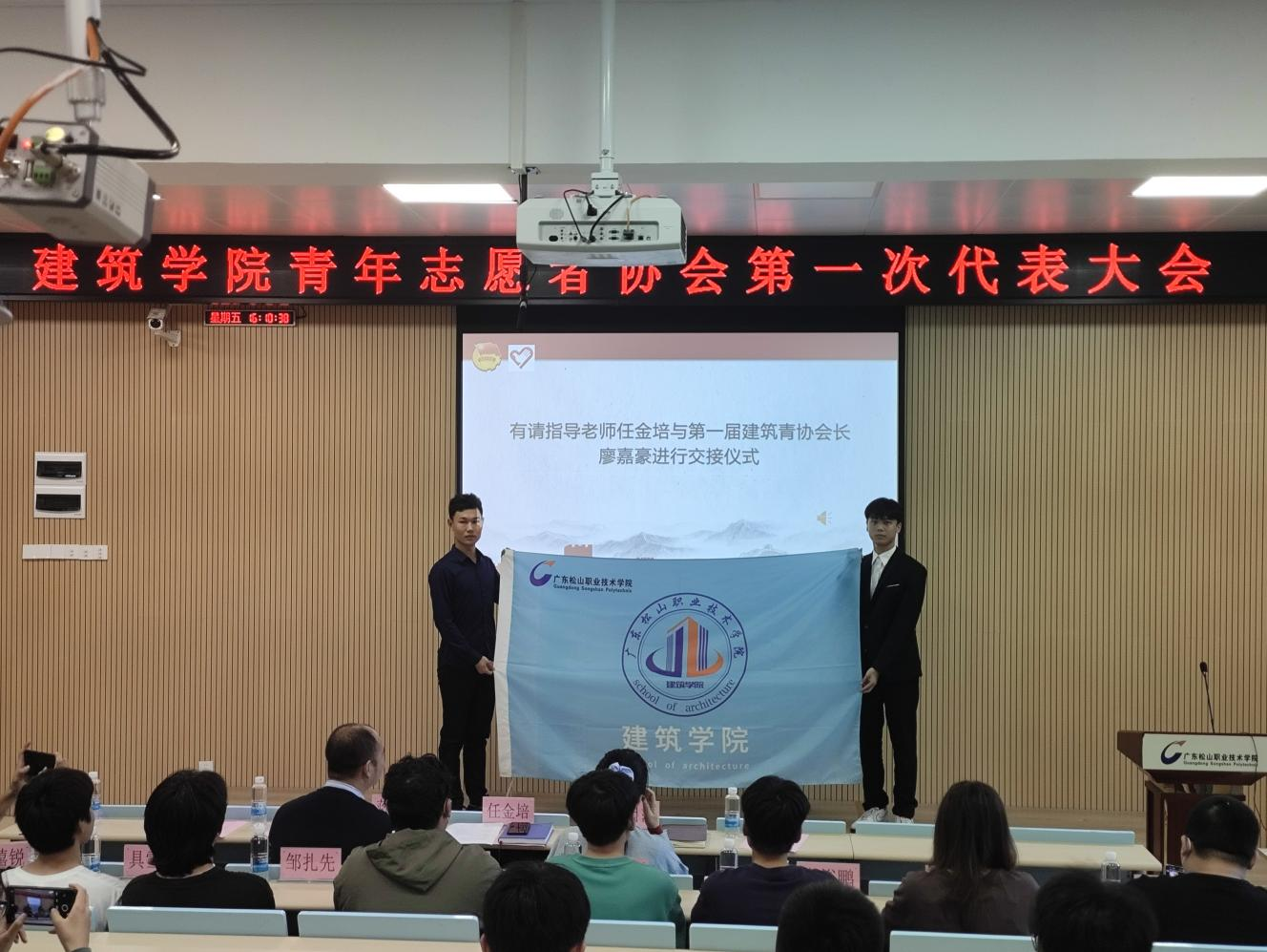 任金培代表建筑学院团委向出席本次大会的老师及同学们表达了衷心的感谢。他表示,建筑学院青年志愿者协会的发展离不开各位的辛勤付出,希望建筑学院青协将以志愿服务为载体,创新志愿服务项目体系,推进我院志愿服务新高地建设。在热烈的掌声中,指导老师任金培与第一届会长廖嘉豪完成了交接仪式。至此,此次大会圆满结束。