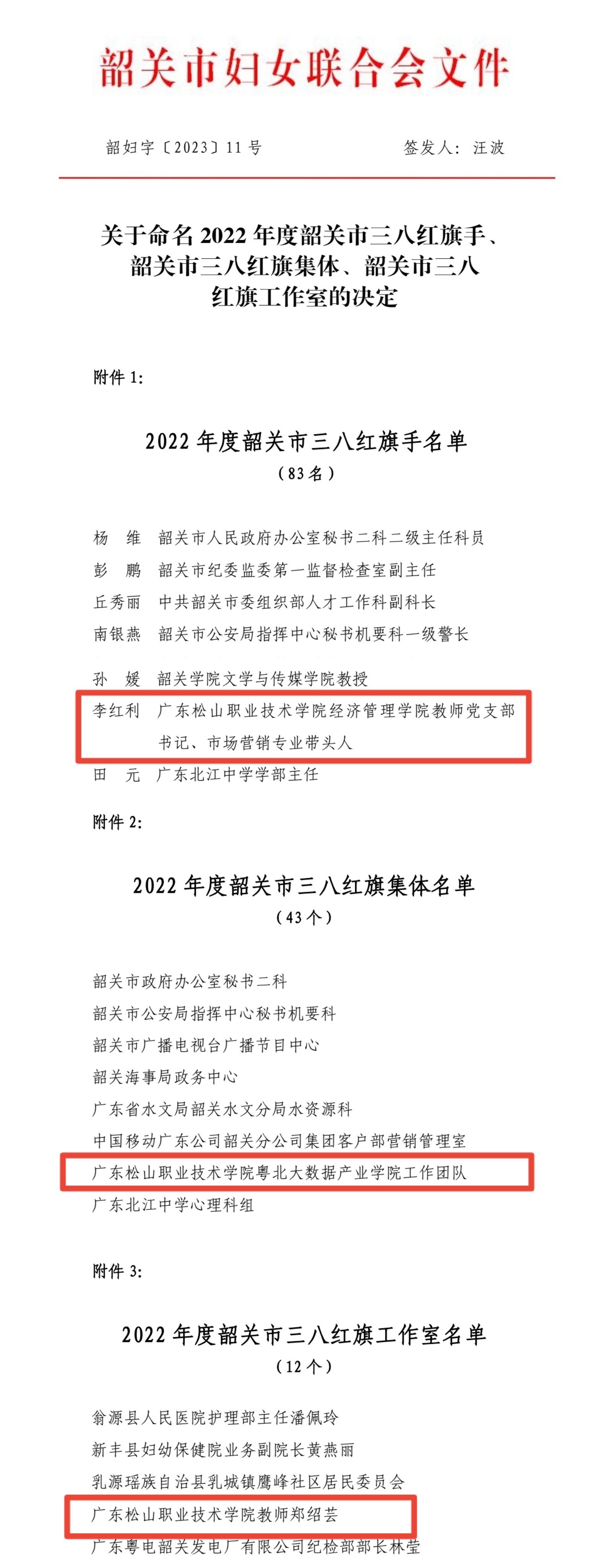 在2023年“三八”国际妇女节来临之际,为树立榜样,鼓励先进,引导和激励广大妇女听党话跟党走,近日,韶关市妇联下发了《关于命名2022年度韶关市三八红旗手、韶关市三八红旗集体、韶关市三八红旗工作室的决定》(韶妇字〔2023〕11号)。我校在本次评选中取得了历史性突破,三项命名全部获评。其中,经济管理学院教师党支部书记、市场营销专业带头人李红利获“2022年度韶关市三八红旗手”命名,粤北大数据产业学院工作团队(负责人:王玉贤)获“2022年度韶关市三八红旗集体”命名,机械工程学院郑绍芸获“2022年度韶关市三八红旗工作室”命名。