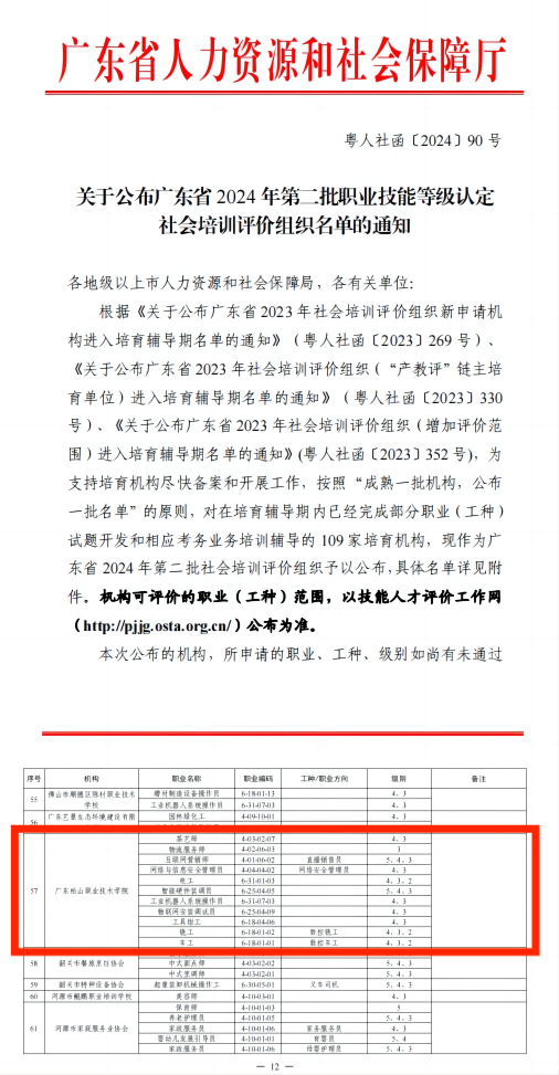 根据《关于公布广东省 2024 年第二批职业技能等级认定社会培训评价组织名单的通知》(粤人社函〔2024〕90号)文件精神,我校茶艺师等11个职业工种共计26个等级均通过了培育期审核,我校正式成为广东省社会培训评价组织。